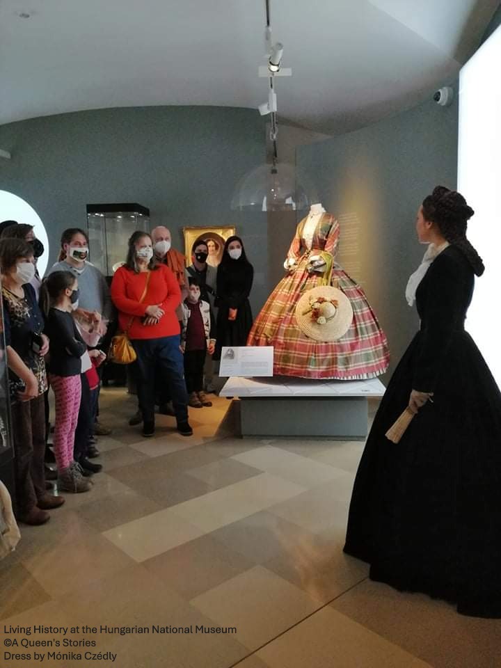 Since Autumn 2021, she has been a guest of the Móra Ferenc Museum in Szeged, the Savaria Museum in Szombathely, and has had several sold-out program as a Living History Interpreter at the Hungarian National Museum. She has been actively researching the life of the Queen for almost 20 years, and has invested the knowledge she has acquired during this time to good use in her work: she considers it her mission to present Her Majesty as authentically as possible to her guests and the public.
